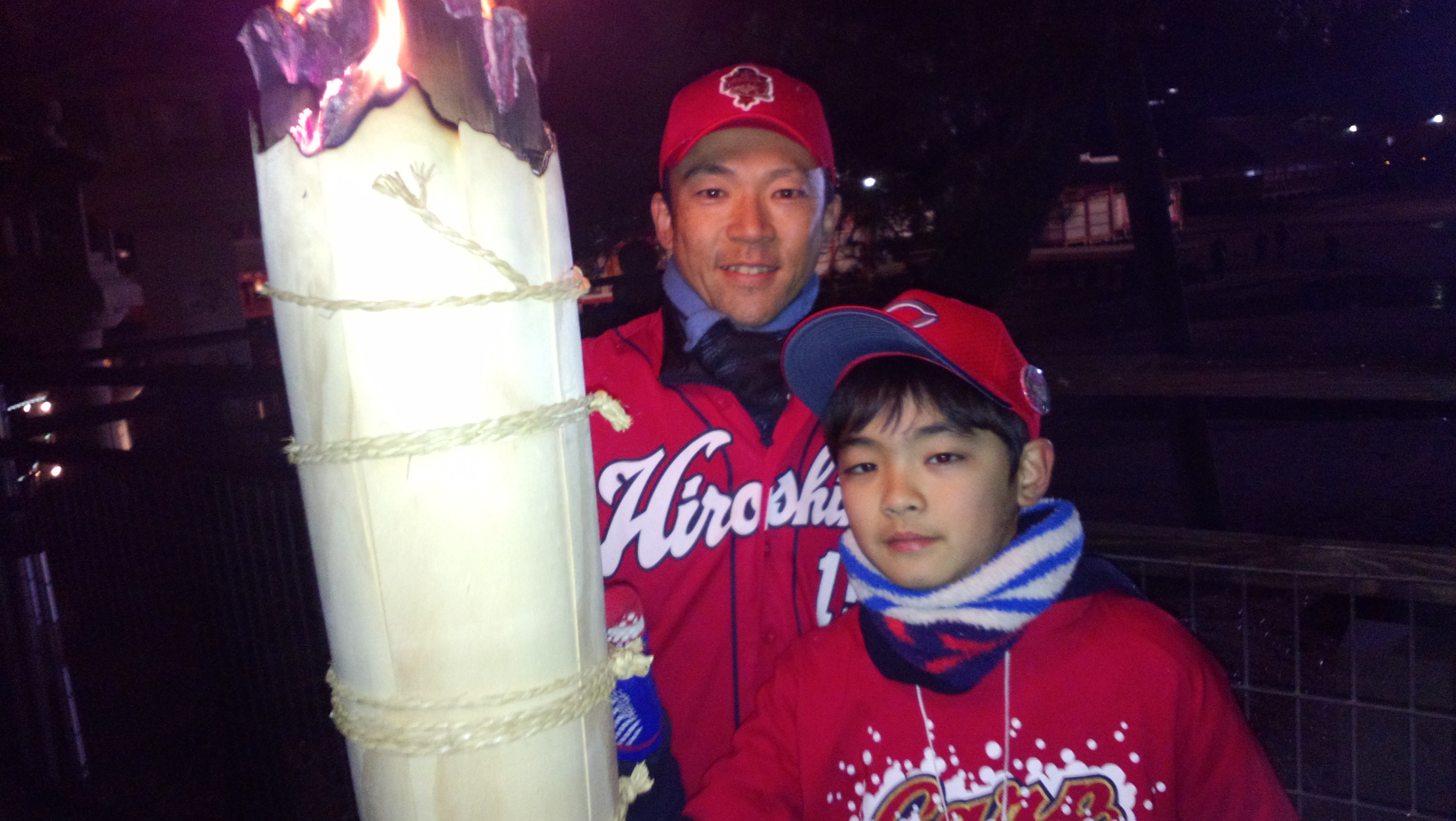 2016/12/31 楽しくにぎやかに! 12月31日 ビールかけTシャツや背番号15のユニフォームで厳島神社境内の御笠浜をたいまつ担いで練り歩きました。 たかクンもお父さんも元気よく「ピッピよいよい」「たいまつよいよい」と鎮火祭を盛り上げました。 素晴らしい新年が迎えられます。