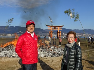 2019/01/14 厳島神社 とんど 1月14日 今年も夫婦そろって「とんど」へ行って来ました。 行った、と言っても家の前のようなものですが・・。 今年は正月飾りや古いお札などに加え、店で売っている「恋みくじ」のお客さんがひいて紐に結び付けたものを一緒に燃やしました。 数千人の「願い」が成就しますように!