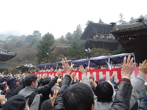 2019/02/03 雨中の豆まき 2月3日 今年はあいにくの雨でしたが、会場は人でいっぱい、熱気であふれていました。 「豆まき」ですが飛んでくるのは紅白の餅やもみじ饅頭なども。 ついつい本気になって手を伸ばし、しっかりゲット。 十分楽しんで帰りました。