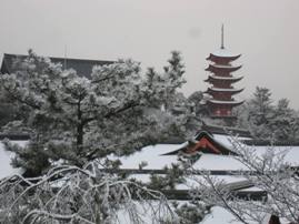 宮島は大変寒いお正月を迎えました。今日2日は昼から大雪、写真は当店2階からの雪景色です。アッという間に厳島神社の屋根や 五重の塔が真っ白に!。