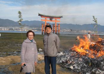 2015/01/14 今日14日は厳島神社のとんど。大勢のカメラマンが来られていました。天気も良く燃え上がる火の向こうに朱の大鳥居が・・。いい写真が撮れたかな? みなさん当店で甘酒を飲んで帰られました。