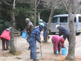 2015/01/17 「宮島さくら・もみじの会」 今年最初の作業を1月17日(木)に実施しました。樹木にとって一番大事な寒肥えなので寒い中みんな頑張って実施しました。今年も素晴らしい桜と紅葉と観光客のみなさんの笑顔が見られるよう・・願って!